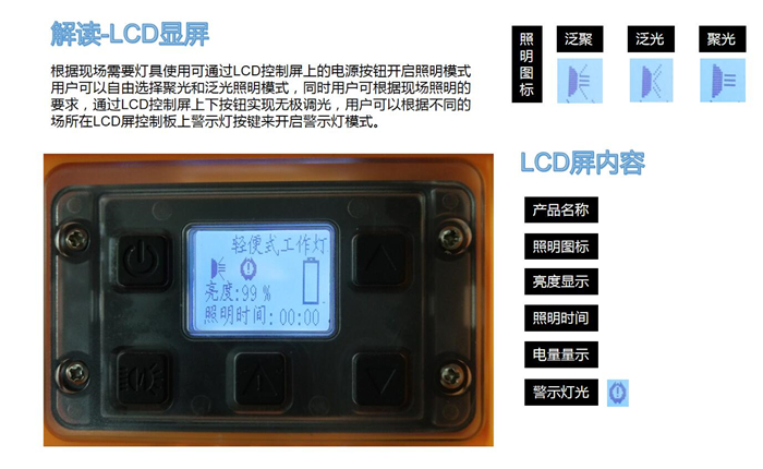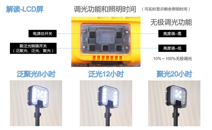 4、針對不同的照明模式,可手動進(jìn)行10-100%的無極調(diào)光,同時可在LCD顯示屏上直觀的顯示剩余電量,預(yù)算可繼續(xù)工作時間。
