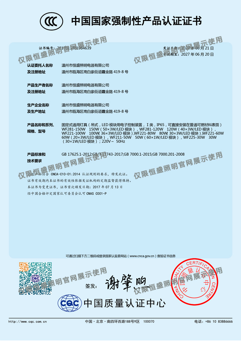 溫州恒盛照明電器有限公司研發(fā)、生產(chǎn)工業(yè)照明設(shè)備已有十六年多歷史,得到了廣大用戶的熱誠支持和幫助。CCC認(rèn)證的通過,將進(jìn)一步促進(jìn)我們不斷開拓創(chuàng)新,嚴(yán)格科學(xué)管理,以更加優(yōu)質(zhì)、更加可靠、安全的產(chǎn)品為用戶服務(wù)。