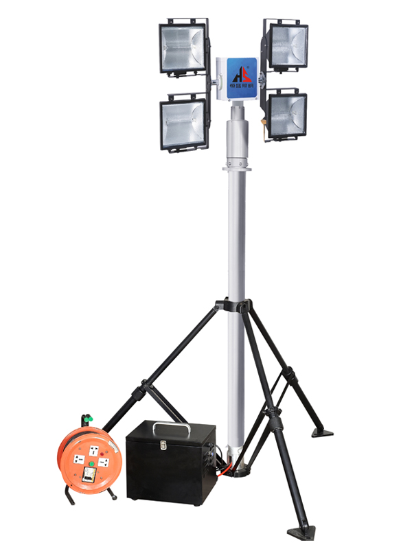 3.1 燈具下部氣桿采用可調(diào)式三腳支架支撐,在不超過 15°的斜坡、 碎石路面及面積狹窄的地方均能可靠固定;發(fā)電機(jī)組底部裝有萬向 輪,可在坑洼不平的路面上方便移動(dòng)。