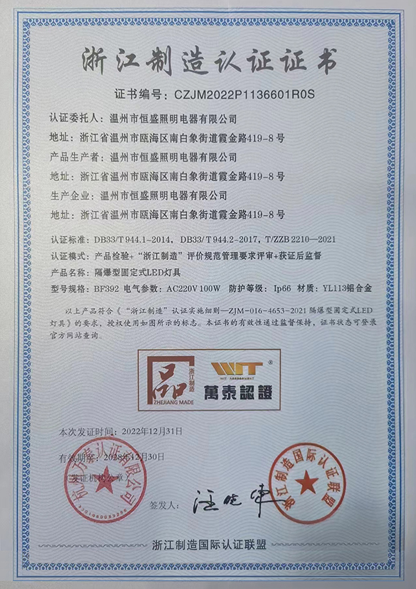 2022年12月 ,溫州市恒盛照明電器有限公司順利通過了產(chǎn)品檢驗與“浙江制造” 評價規(guī)范管理要求評審 ,獲得《浙江制造認(rèn)證證書》 !我司將會繼續(xù)不斷創(chuàng)新 ,開拓進取 ,努力將更優(yōu)質(zhì)的產(chǎn)品輸送給市場 ,感謝新老客戶一直的信賴與支持。