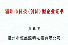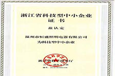 繼獲得溫州市科技企業(yè)榮譽之后,恒盛照明一鼓作氣拿下了《浙江省科技型中小企業(yè)》殊榮。頒證時間為2014年12月,編號為:20143303002108。 這塊...