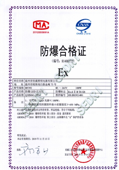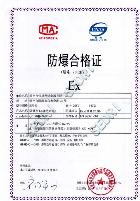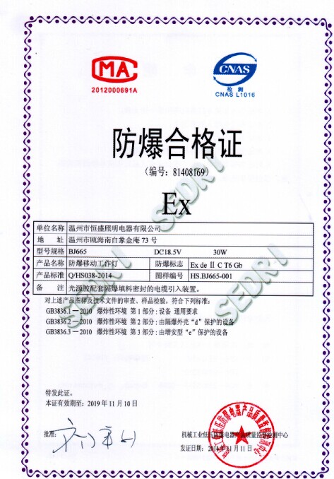更多防爆合格證可以通過聯(lián)系恒盛照明公司查詢了解,公司始終以品質(zhì)為第一,努力打造防爆移動工作燈、佩戴式防爆強光照明燈、節(jié)能防爆強光電筒、防爆LED泛光燈等為主的防爆燈具生產(chǎn)基地。