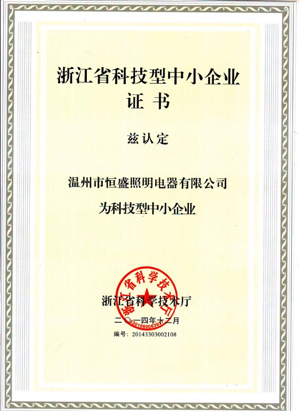 聯(lián)系人:劉經(jīng)理繼獲得溫州市科技企業(yè)榮譽(yù)之后,恒盛照明一鼓作氣拿下了《浙江省科技型中小企業(yè)》殊榮。頒證時(shí)間為2014年12月,編號(hào)為:20143303002108。