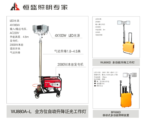1、從上面上市產品列表不難發(fā)現(xiàn),2016新產品的特點除了LED外還是LED。比如LED款全方位自動升降泛光工作燈(WJ880A-L),LED車載遙控探照燈(WJ828D)這兩款產品傳統(tǒng)光源都是選用氙氣,鹵鎢燈,金鹵燈,鈉燈等光源。恒盛照明企業(yè)在LED應用到爐火純青階段全部更新為LED光源。經過現(xiàn)場測試,同等條件下LED光源完勝鹵鎢燈光源。