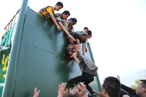 后面就是洪水猛獸,后面就是烈火洶洶,危險40分鐘后就要降臨。團隊50多人必須在這個時間內(nèi)翻越一堵高四米,光滑沒有任何依附物的墻。我們也沒有繩索,沒有支撐物,沒有救兵。只有雙手與雙臂,只有我們勇于承擔的肩膀,只有用我們的智慧,只有用我們的默契配合才能翻越障礙,獲得自由。這就是“跨越2017”設(shè)置的場景。