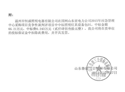 日前,市場又傳喜汛,在國網(wǎng)山東省電力公司2015年應(yīng)急管理中心采購項(xiàng)目招標(biāo)中中標(biāo)照明設(shè)備包01。