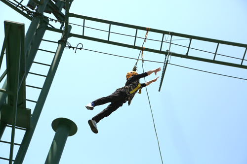 “飛躍2017”高空抓杠項目就是要在穿戴安全防護裝備及保護繩的情況下,徒手攀爬到20米高的平臺,再邁到一根獨立風中搖搖晃晃的圓柱上,拘身躍起,抓住兩米開外的一根吊桿才算圓滿完成。筆者開始就擔心起來,倒不是安全問題。就是覺得男生完成本項目應(yīng)該都不在話下,關(guān)健時平常說話細聲細氣纖弱的女同事們可是一場天大的考驗。
